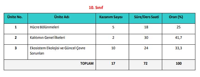 Kaynak: 2018-2019 10. Sınıf Biyoloji müfredatı, Ünite sayısı, konuları, kazanım sayısı ve ders süreleri ne kadar?