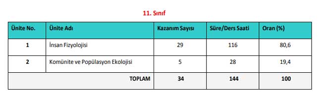 Kaynak: 2018-2019 11. Sınıf Biyoloji müfredatı, Ünite sayısı, konuları, kazanım sayısı ve ders süreleri ne kadar?